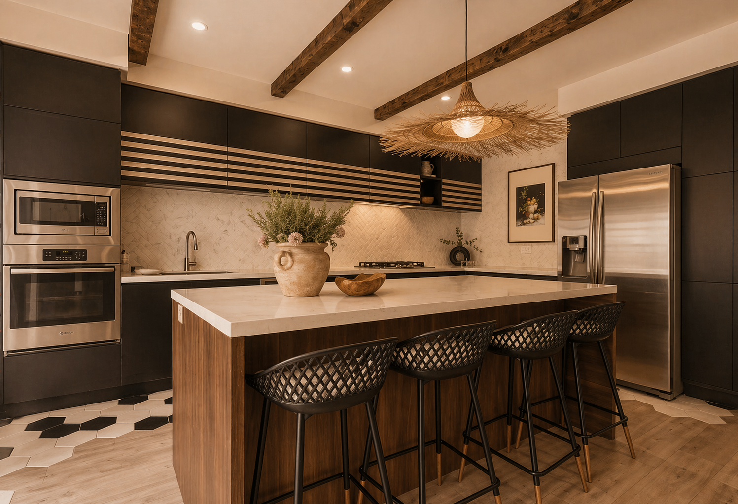 Natural wood tones, reclaimed ceiling beams, and matte black cabinetry create a home that feels warm and grounded with real personality. Every material and finish was selected for how it would age — not just how it photographs.