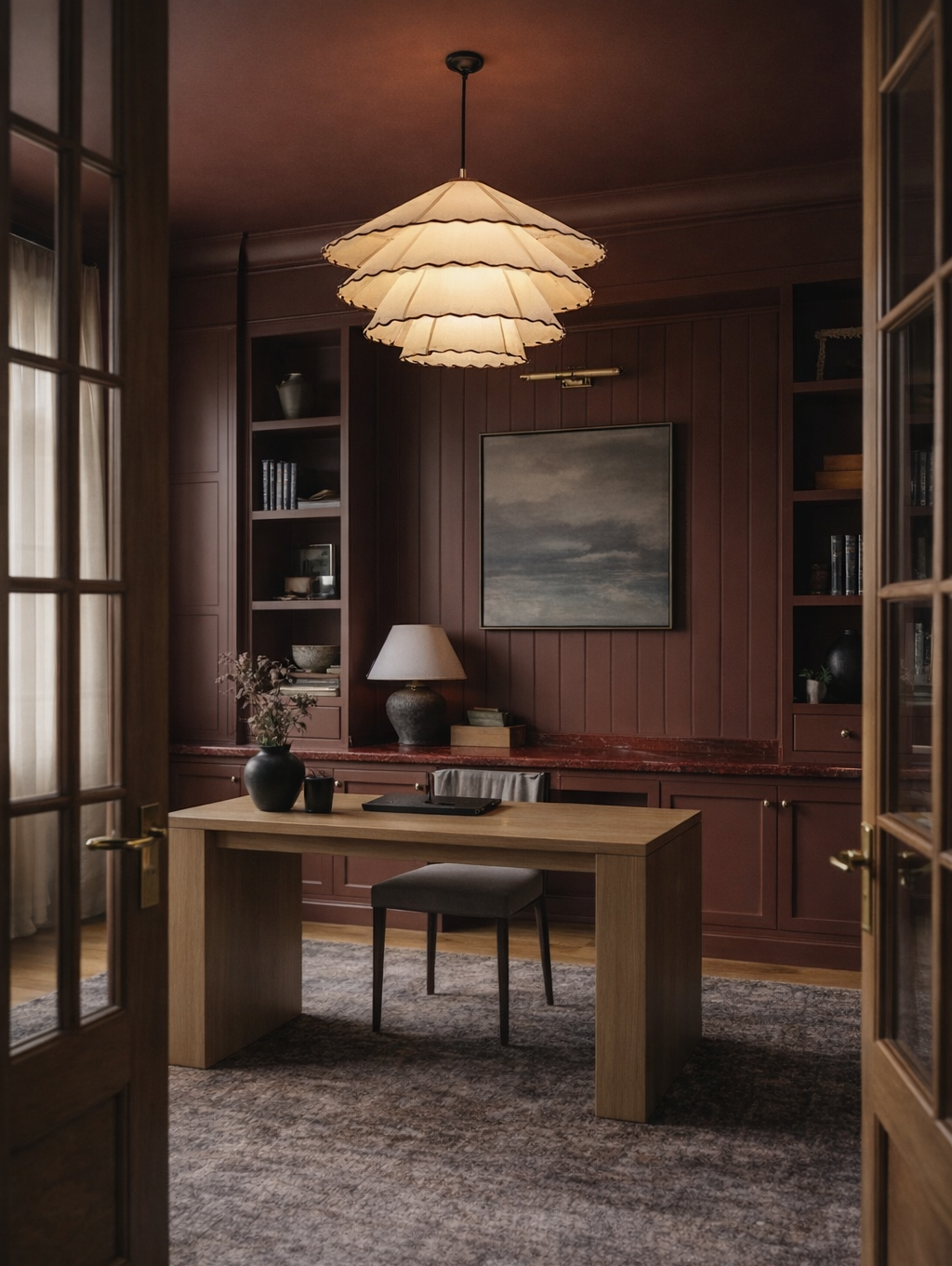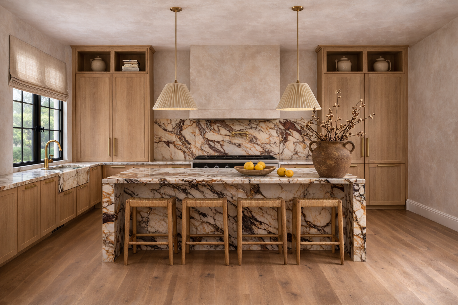 Every room speaks the same language — natural stone, aged metals, plaster, and oak — but each finds its own register. Some quiet, some dramatic. All considered.
