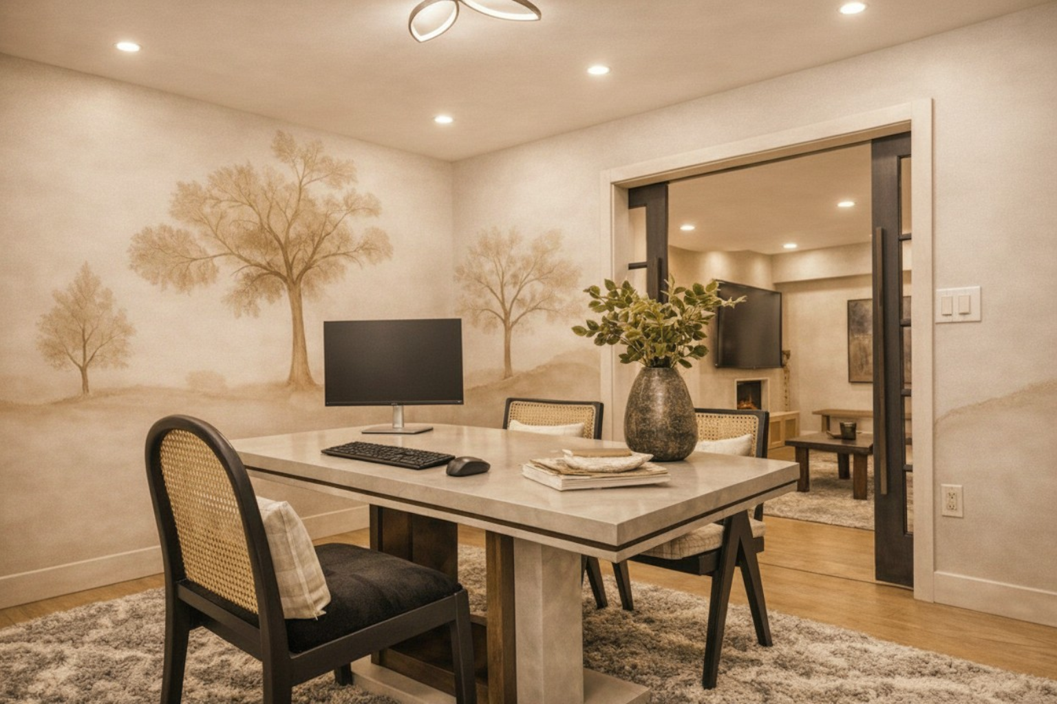 From the hand-painted botanical entry mural and herringbone tile floor to the painted wood ceilings, custom walnut built-ins, and tonal plaster wall treatments — every element was selected with both visual calm and long-term durability in mind. Design and construction were developed in tandem, ensuring nothing was lost between what was envisioned and what was built.