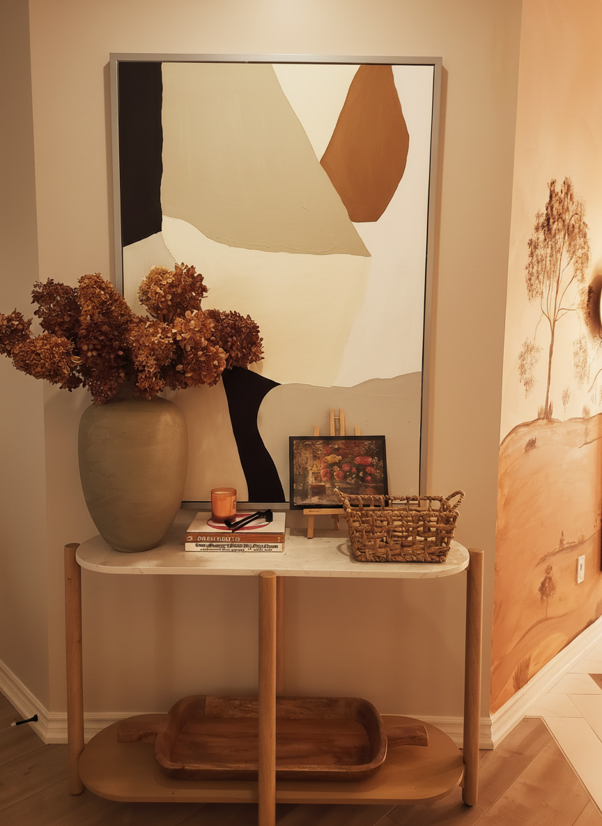 The home explores contrast in its most subtle form — soft textures against structured lines, warm neutrals anchored by architectural detail, and layered finishes that feel cohesive rather than decorated.